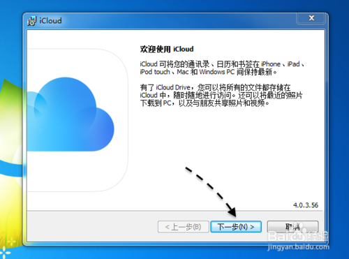 當下載完成以后,運行 iCloud 安裝程序,點擊“下一步”按鈕繼續(xù)。