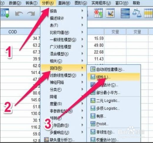 5、點(diǎn)擊【分析】---【回歸】---【線性】