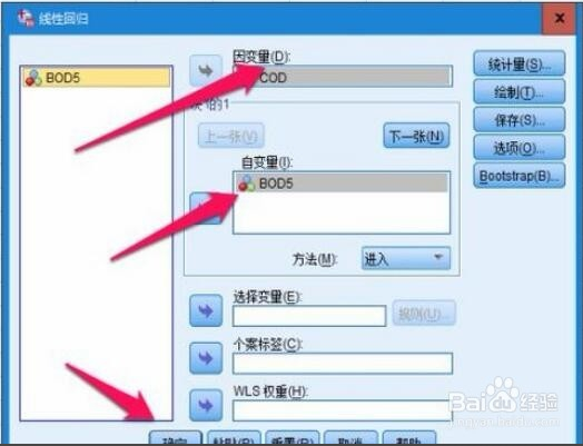 6、在彈出的線性回歸框中設(shè)置自變量和因變量,其他的選項(xiàng)用默認(rèn)設(shè)置即可,其他的選項(xiàng)只是用來(lái)更加精確地去優(yōu)化模型