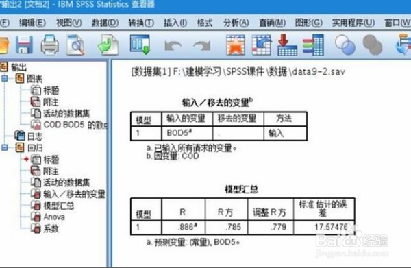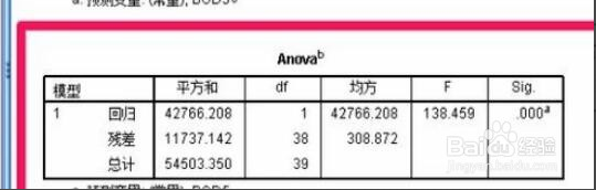 8、【Anova表】表示分析結(jié)果,主要看的是F和Sig值,F(xiàn)值對(duì)應(yīng)的Sig值小于0.05就可以認(rèn)為回歸方程是有用的,