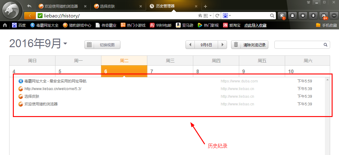3.打開“歷史管理器”看到這里面就是之前所有的網(wǎng)頁記錄了,點擊周二便展現(xiàn)周二所有的瀏覽記錄。需要回看哪個,就把鼠標(biāo)放在哪兒,點擊進去就可以了。在這里你可以修改日期,選擇查看哪一段的歷史記錄,點擊日期處自己選擇即可。也可以根據(jù)關(guān)鍵字在搜索框中輸入查詢,這樣可快速找到你想要的歷史記錄。這里還有一個重要的功能就是你可以在這里清除獵豹瀏覽器的緩存,只需要點擊“清除瀏覽記錄”就行,定時清除緩存可讓瀏覽器速度更快更好用。