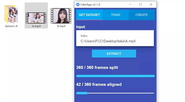 咱們姑且用A和B來區(qū)分這兩個(gè)小姐姐好了,按照FakeApp的提示,將素材路徑填入,點(diǎn)擊EXTRACT,接下來無需任何操作,等程序跑完就行了。你會(huì)看到fake文件夾中多出了一個(gè)dataset-A的目錄,這便是我們待會(huì)兒訓(xùn)練模型時(shí)需要的數(shù)據(jù)集了。A的訓(xùn)練集生成后,重復(fù)這一步驟,生成B的訓(xùn)練集。至此,咱們第一步結(jié)束了。