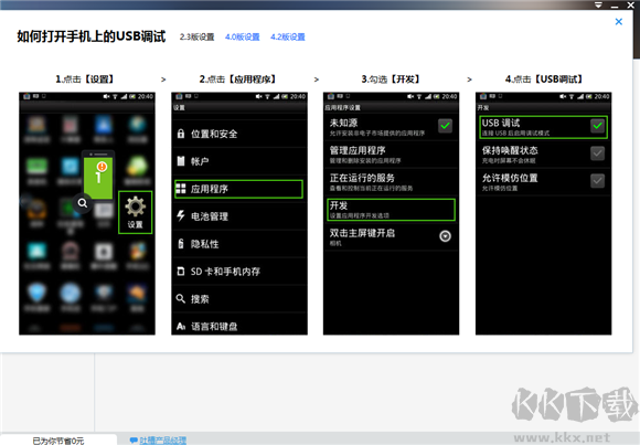 3、檢查您是否有開啟了【USB調(diào)試】功能,如果您對開啟方法不清楚也不要著急,請參考下圖。