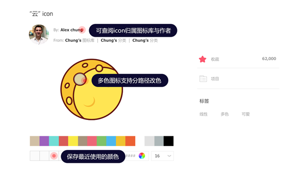 下載詳情頁:可查閱icon歸屬圖標庫與作者,多色圖標支持分路徑改色,下載圖標自動保存最近使用的顏色