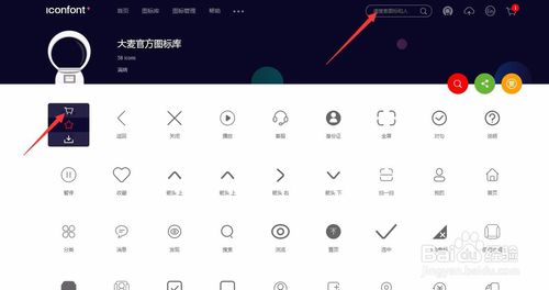 然后點擊左上角的“圖標”進入圖標庫,選擇你喜歡的圖標并加入購物車(鼠標經(jīng)過鼠標會有三個按鈕圖標,分別是加入購物車,收藏,下載),你也可以在右上角的搜索框中輸入你想要的圖標名稱。