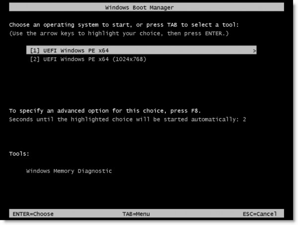 UEFI模式的啟動菜單:(UEFI模式一般使用微軟的BootMgr控制啟動,無法做的更豐富)