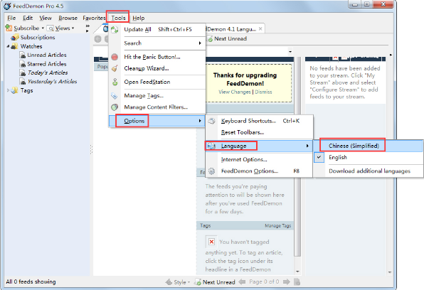 在搜索引擎中輸入FeedDemon,點(diǎn)擊第一個(gè)結(jié)果進(jìn)入官網(wǎng)可直接下載,F(xiàn)eedDemon已宣布免費(fèi),安裝后可在工具選項(xiàng)中選擇語(yǔ)言簡(jiǎn)體中文。