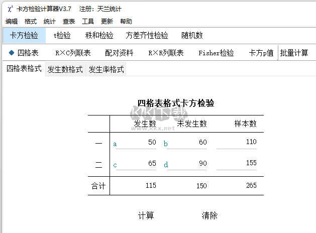 當(dāng)兩個樣本資料中有發(fā)生數(shù)和未發(fā)生數(shù)時可使用此方法計算X2值及P值范圍,在輸入四個數(shù)字后回車或點擊計算按鈕可在右上結(jié)果欄中顯示計算結(jié)果,其它計算方法相似。