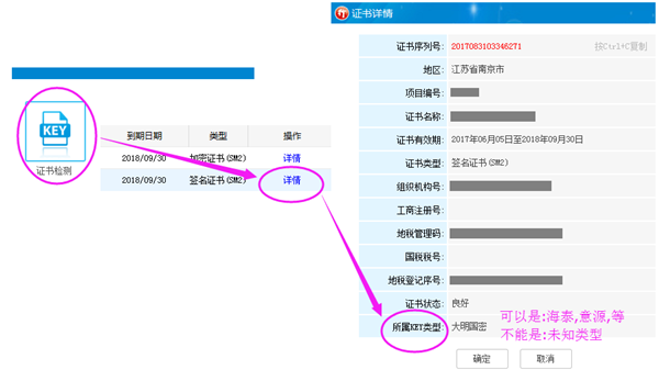 證書未正常識(shí)別說明:打開行助手2.0--證書檢測--不顯示證書名稱,或,證書檢測--詳情--所屬KEY類型--未知類型。