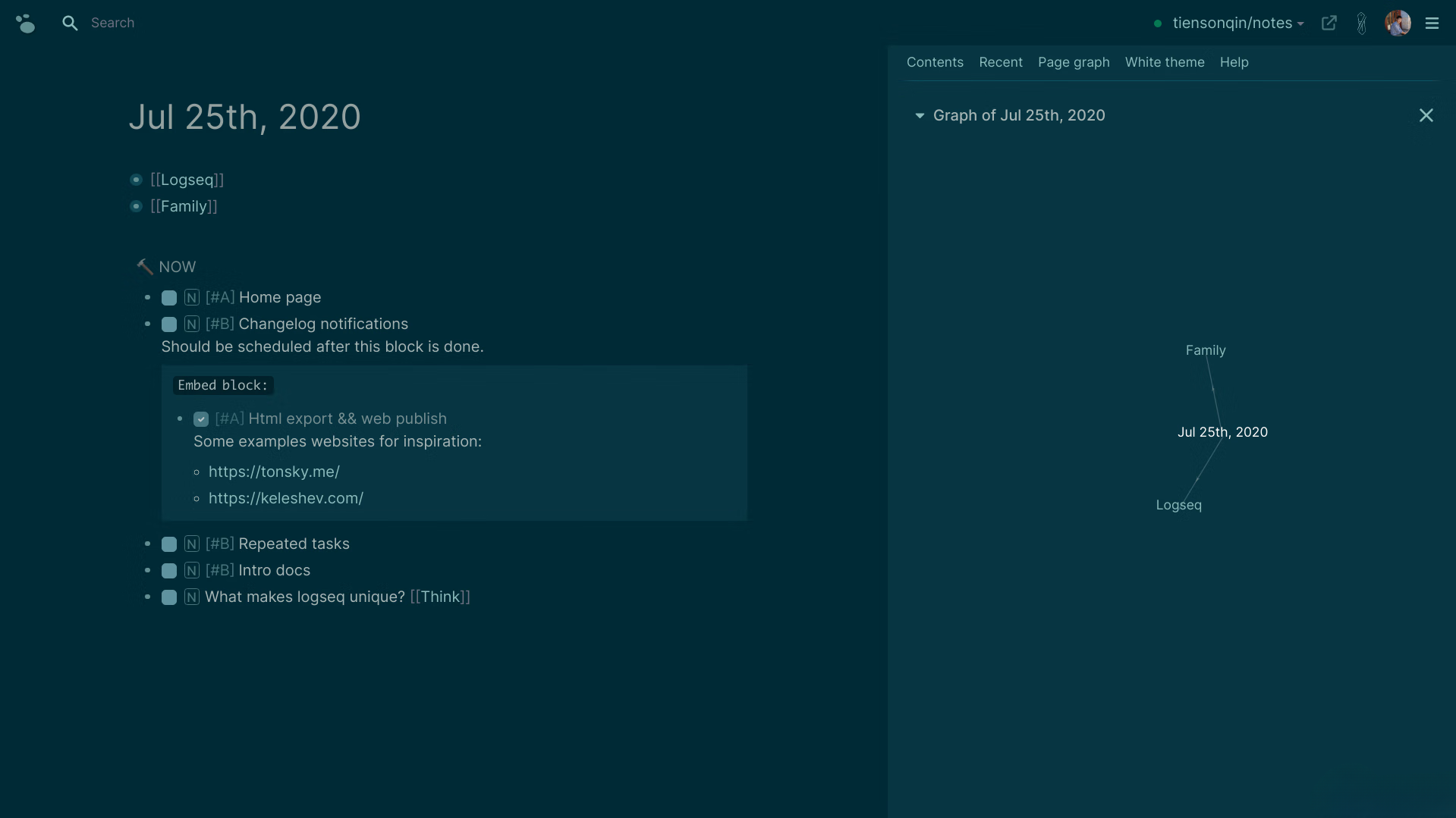 塊和頁面的概念在諸如Notion和石墨文檔一類的云文檔中就有體現(xiàn),但在雙鏈設(shè)計的加持下,Logseq下創(chuàng)建的筆記結(jié)構(gòu)更加清晰明了。