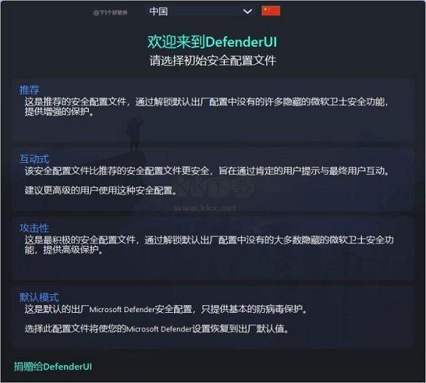 DefenderUI 提供了推薦/互動式/攻擊性/默認模式4種模式,對應4種不同的配置,用戶可以隨時切換。這款軟件兼容Win10和Win11,界面語言支持簡體中文。