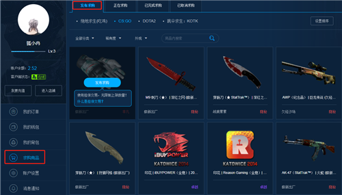 1、登錄您的V5FOX賬戶(hù),進(jìn)入個(gè)人中心的求購(gòu)商品板塊,選擇游戲以及對(duì)應(yīng)飾品,即可發(fā)布求購(gòu)。也可點(diǎn)擊平臺(tái)右上方“我要求購(gòu)”按鈕進(jìn)入求購(gòu)頁(yè)面。