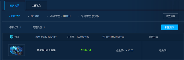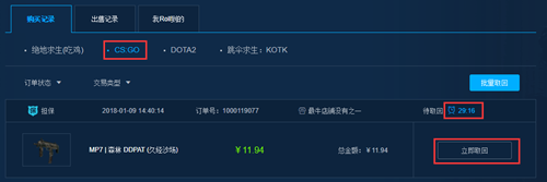 4、確認(rèn)支付并且支付成功后,前往個(gè)人中心我的訂單中查看該訂單,然后取回?!咀ⅲ簱?dān)保交易飾品需要在30分鐘內(nèi)取回,如30分鐘沒(méi)有取回則自動(dòng)取消訂單】