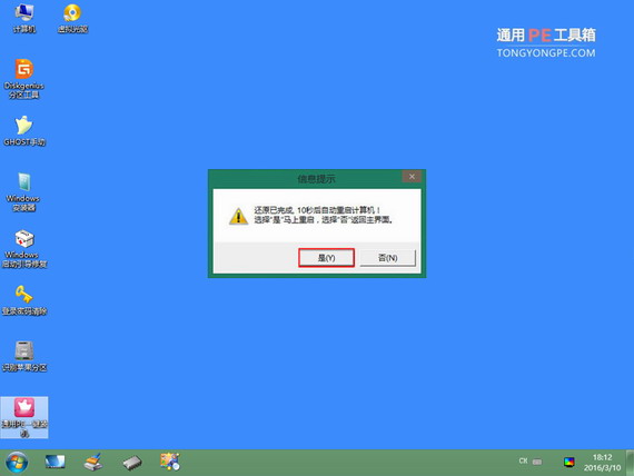 ⑥等待解壓GHO文件的進度條完畢后會自動彈出是否重啟電腦的窗口,我們現(xiàn)在只要點擊"是"按鈕即可,然后它就會自動重啟電腦,最后電腦將會自動安裝系統(tǒng),直到進入電腦桌面為止那就表示ghost系統(tǒng)安裝完畢了,見下圖所示:
