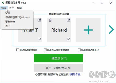 匠石微信多開是一款微信電腦版的多開工具,主要特點是可以無限多開,可配置一鍵多開,無需掃碼就可以登錄,是微信電腦版多開輔助利器,并且支持快捷召喚指定微信。