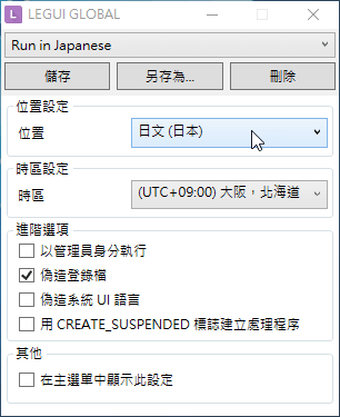 第2步:開啟LocaleEmulator設(shè)定視窗,在「位置設(shè)定」選單選取要顯示的文字語言,其他時區(qū)等進階選項如果有需要的話也可以先勾選。