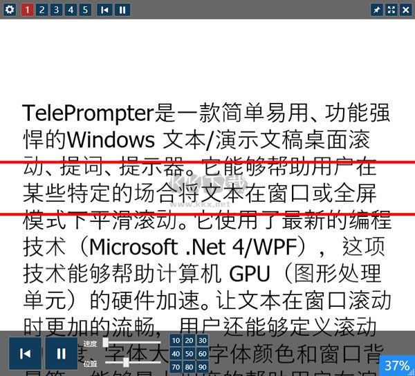 TelePrompter提詞器中文版是一款便捷的電腦桌面提詞器,可以給用戶帶來(lái)強(qiáng)大得到輔助演講工具,可以很好的幫助演講者們?cè)谶@里輕松的進(jìn)行流暢準(zhǔn)確的演講,實(shí)時(shí)的為演講者們提供文字顯示,還支持調(diào)節(jié)速度,支持用戶們?cè)诰€跟隨文字的節(jié)奏進(jìn)行閱讀輕松的完成演講,超多的工具都可以免費(fèi)提供給大家,感興趣的用戶快來(lái)KK下載體驗(yàn)吧~