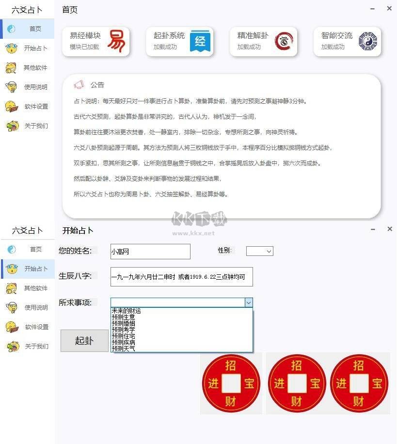 六爻占卜電腦版是一款非常好用的占卜軟件,六爻占卜電腦版擁有超多的算卦規(guī)則,用戶(hù)們只需要將你的生辰八字輸入其中就可以便捷的了解到超多的服務(wù)了,六爻占卜電腦版沒(méi)有廣告打擾用戶(hù)們的使用,你可以便捷的進(jìn)行財(cái)運(yùn)、生意、婚姻等方面的理想占卜工具,感興趣的用戶(hù)快來(lái)KK下載體驗(yàn)吧~