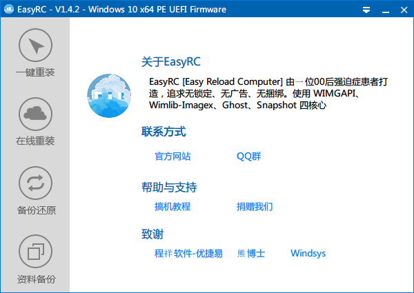 EasyRC是FirPE作者推出的一款一鍵重裝系統(tǒng)軟件,主要功能就是系統(tǒng)重裝(支持本地鏡像)系統(tǒng)備份、還原,還有就是在線重裝,系統(tǒng)采用windsys的系統(tǒng),比較純凈!當(dāng)然了,使用這款重裝系統(tǒng)軟件安裝的系統(tǒng),比較純凈,沒有什么惡意捆綁~軟件做的也非常棒,有需要的可以試試。