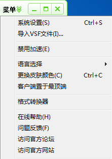 6、菜單包括系統(tǒng)設置、禁用加速、語言選擇、格式轉換器等選項,如圖: