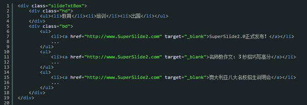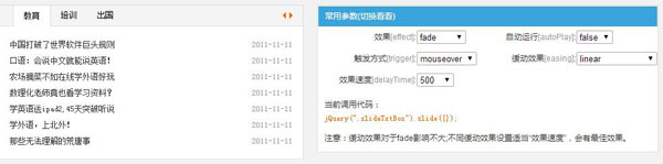 在本例中,請?jiān)?“.slideTxtBox” div結(jié)束后立刻調(diào)用插件,這樣會得到最好的效果,避免整個(gè)頁面加載后再調(diào)用;因?yàn)槭悄J(rèn)HTML結(jié)構(gòu),所以參數(shù)都為默認(rèn)值,不用填寫titCell、mainCell等。