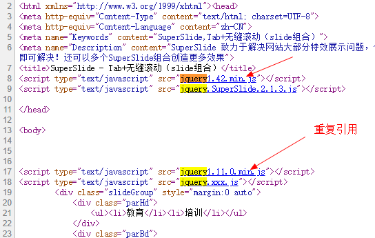 這種情況通常是引用了多個(gè)jquery插件,每個(gè)插件都引用一個(gè)jquery.js,其實(shí)是多余的,只需保留一個(gè)即可。