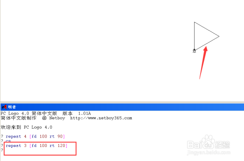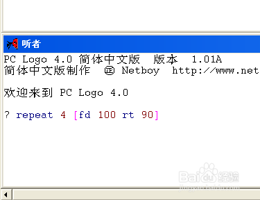 即【fd 100 rt 90】,這條命令表示前進(jìn)100個(gè)長(zhǎng)度單位,右轉(zhuǎn)90度。