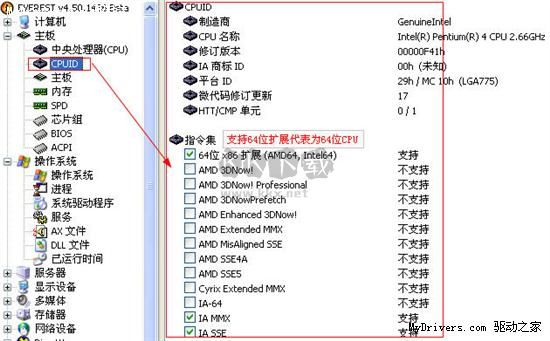 用EVEREST Ultimate Edition查看自己的CPU情況分析,一般建議查看CPUID,這樣查看更清楚詳細。通過查看指令集可以判斷自己的CPU是否大強。其實是支持的指令越多,代表你的CPU越好。這些查看電腦硬件信息的菜單我就不多說了,大家可以自己點擊菜單里的選項去慢慢查看。如果有不懂請到論壇去發(fā)貼求助。