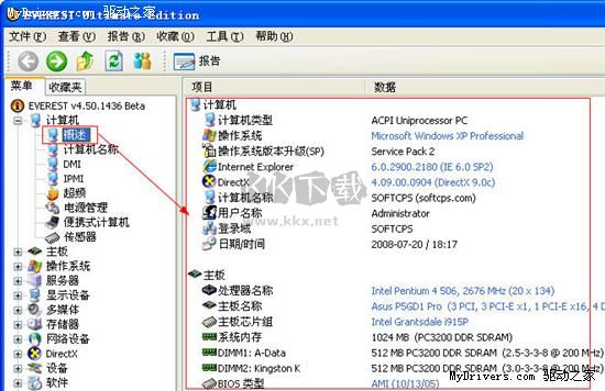 EVEREST Ultimate Edition 啟動后,首先要看的就是計算機“概述”,單擊“計算機”圖標可以打開“概述”。單擊“概述”后將在EVEREST Ultimate Edition 界面左邊顯示出我們計算機的一些詳細情況。如下圖所示,這里的信息比我們自己在電腦上查看的清楚得很。
