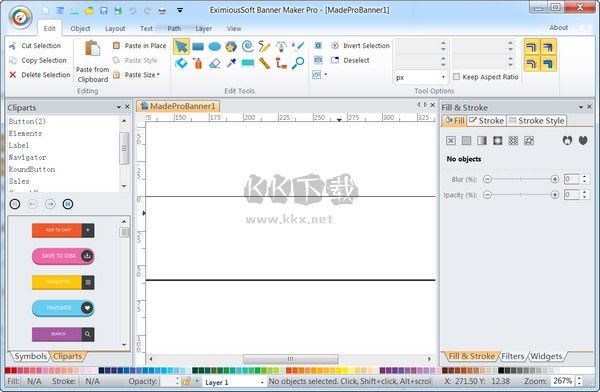 程序界面非常友好,允許您僅通過拖動或單擊來創(chuàng)建,移動,縮放,旋轉和鏡像形狀或文本。制作具有專業(yè)外觀的橫幅變得非常容易。所有布局圖紙元素均具有翻轉,鏡像,分組,取消分組,對齊和調整z順序的功能。