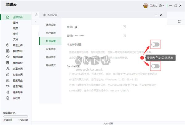 5、開啟「本地賬號」和「Samba」,按鈕綠色為開啟狀態(tài)。
