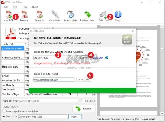 5、輸入一個URL,如“www.pdflinkeditor.com”,并點(diǎn)擊“Inset URL”按鈕。 該程序?qū)釉撨^程并在幾秒鐘內(nèi)完成。