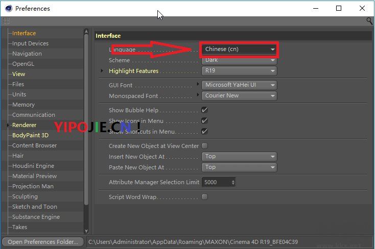 6.軟件自動重啟后如不是中文界面的解決方法是,ctrl+E組合鍵打開preferences(設置)對話框,如下圖改成”Chinese(cn)”