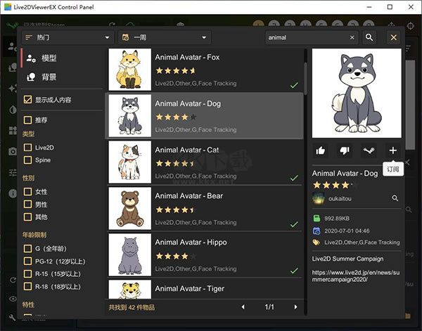 1、用戶自由添加模型:支持添加Live2D標(biāo)準(zhǔn)文件格式的模型(包括Facerig模型)以及Live2DViewerEX的LPK模型包。