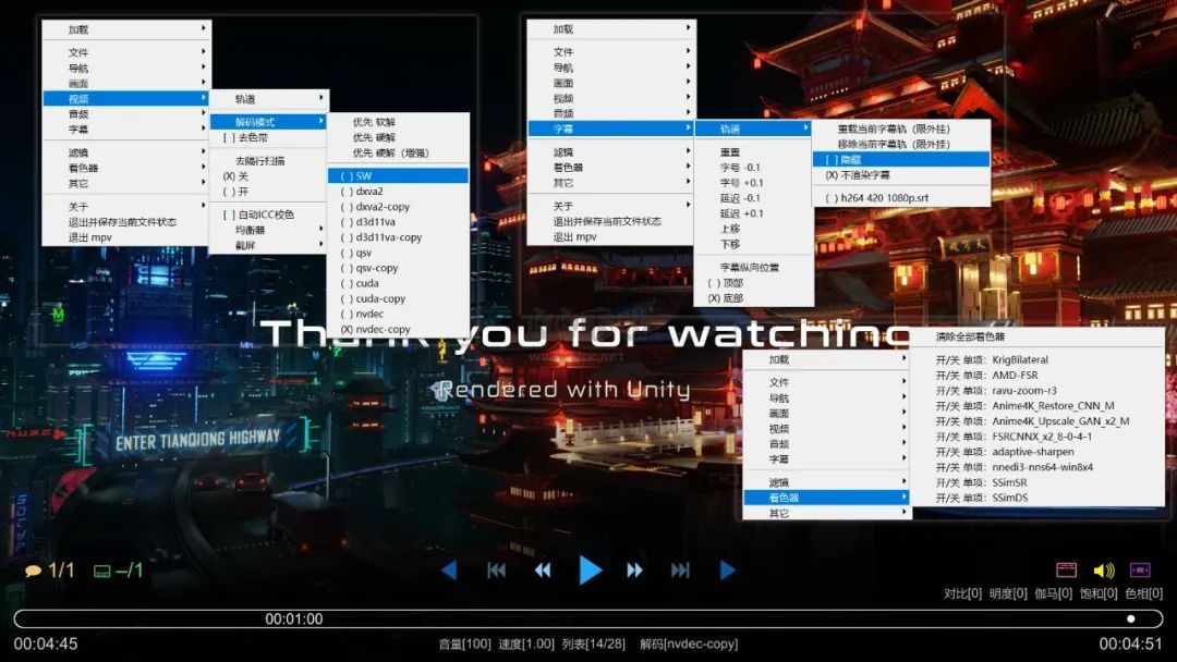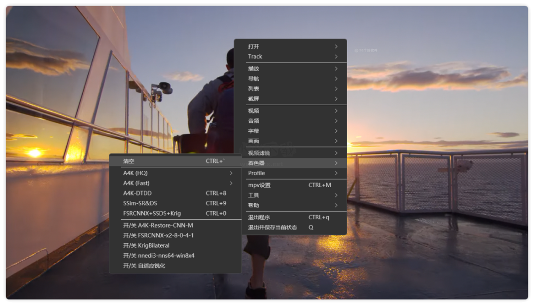 而「mpv.net-DW」已經(jīng)把這些常用主流的解碼器、濾鏡、著色器等各種插件都整合到一起了,并且修改了右鍵菜單,方便你選擇切換濾鏡和著色器方案選擇。