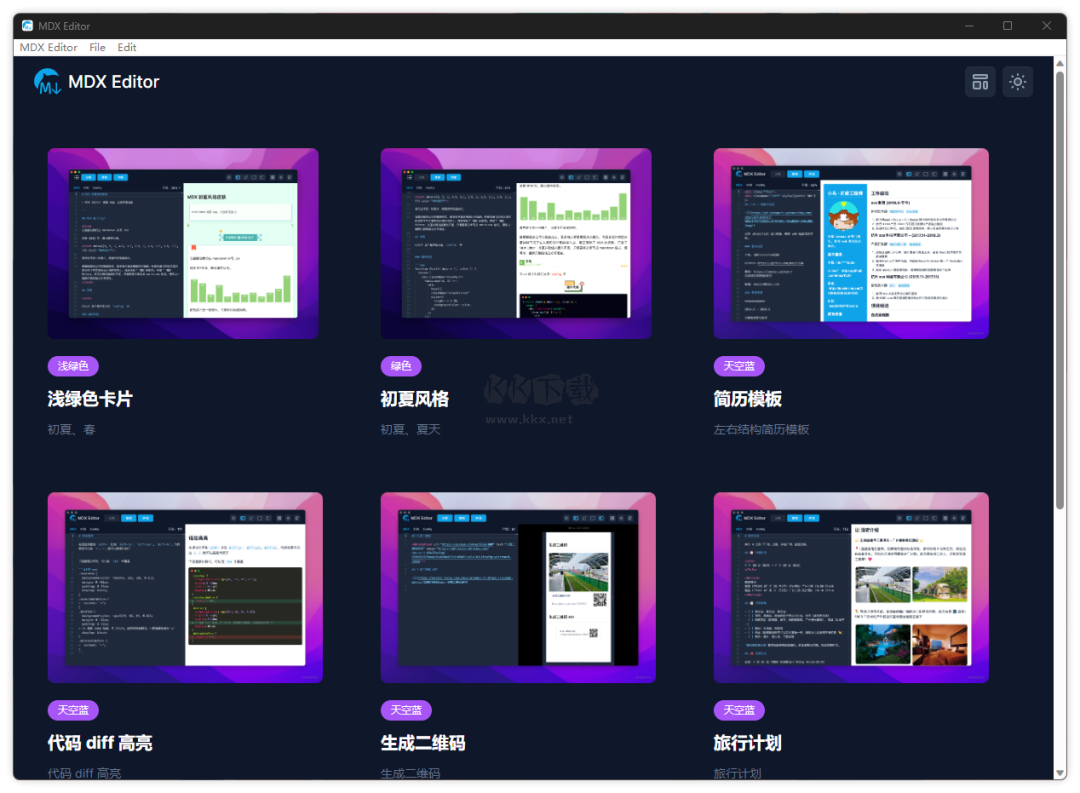 默認(rèn)「MDX Editor」提供了幾個(gè)不錯(cuò)的筆記模板,包括有個(gè)人簡歷、旅行計(jì)劃、代碼高亮、會(huì)議模板等。