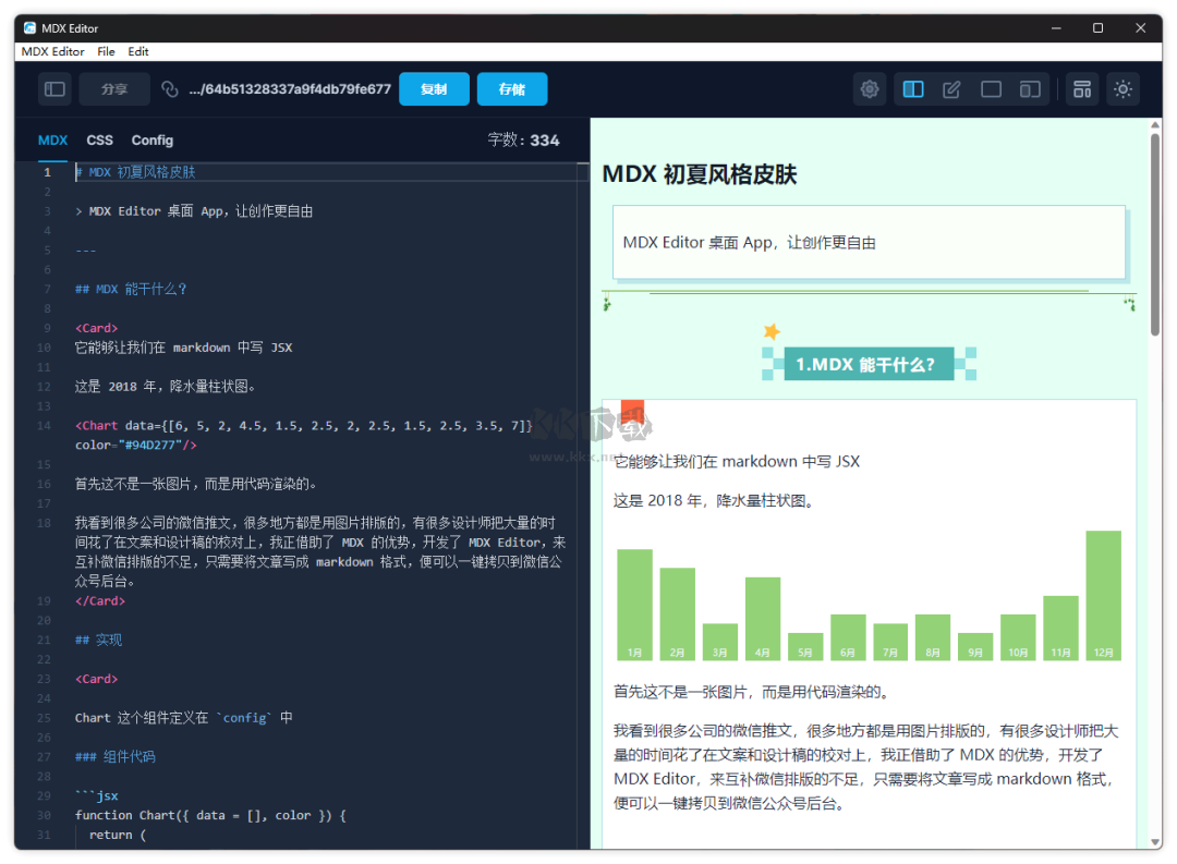 其它功能方面,支持把編輯好的內(nèi)容通過生成網(wǎng)址方式分享、支持保存為 md 和 mdx 格式。