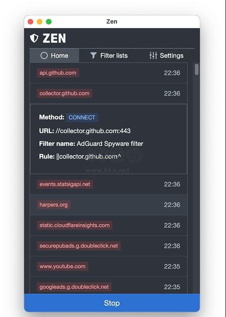 在「Zen」主頁(yè)可以看到過濾阻止的記錄,點(diǎn)擊可以查看詳情情況,包括地址、規(guī)則、請(qǐng)求等。