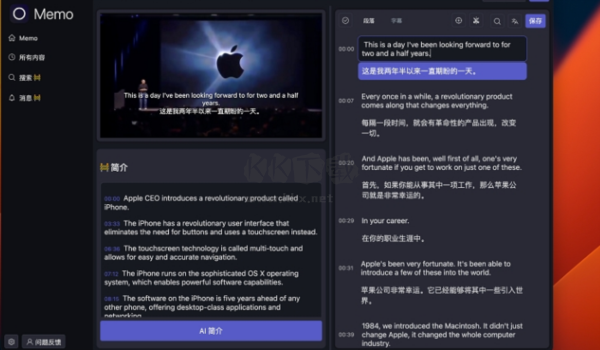 Memo AI視頻字幕工具是一款小型好用的AI音視頻轉(zhuǎn)譯工具,支持用戶(hù)們?cè)诰€(xiàn)利用AI技術(shù)來(lái)進(jìn)行YouTube等視頻的轉(zhuǎn)文字,支持多種語(yǔ)種之間的翻譯使用,你可以在這里高效的進(jìn)行AI音視頻轉(zhuǎn)譯個(gè)工具適用于多種場(chǎng)景讓用戶(hù)們可以在這里便捷的提供視頻字幕,還能對(duì)字幕進(jìn)行調(diào)節(jié)使用,輕松的進(jìn)行編輯,感興趣的用戶(hù)快來(lái)KK下載體驗(yàn)吧~