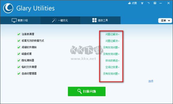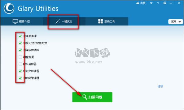 3、在軟件界面中點(diǎn)擊切換到一鍵優(yōu)化界面當(dāng)中,勾選想要掃描優(yōu)化的一些模塊之后點(diǎn)擊掃描問題按鈕。