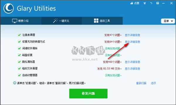 4、點(diǎn)擊這個掃描問題按鈕之后,接下來下一步就是等待掃描完成,掃描完成之后我們在界面右邊點(diǎn)擊顯示詳細(xì)信息選項(xiàng),可以查看掃描出來的問題詳細(xì)內(nèi)容。