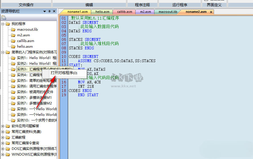 2..方便練習(xí)資源導(dǎo)航欄中的“簡(jiǎn)單的入門程序?qū)嵗?rdquo;、“DOS匯編實(shí)例源程序”、“WINDOWS匯編實(shí)例源程序”中的程序,如圖所示,右鍵打開(kāi)簡(jiǎn)單入門程序?qū)嵗械腍ello World程序?qū)φ站毩?xí)。
