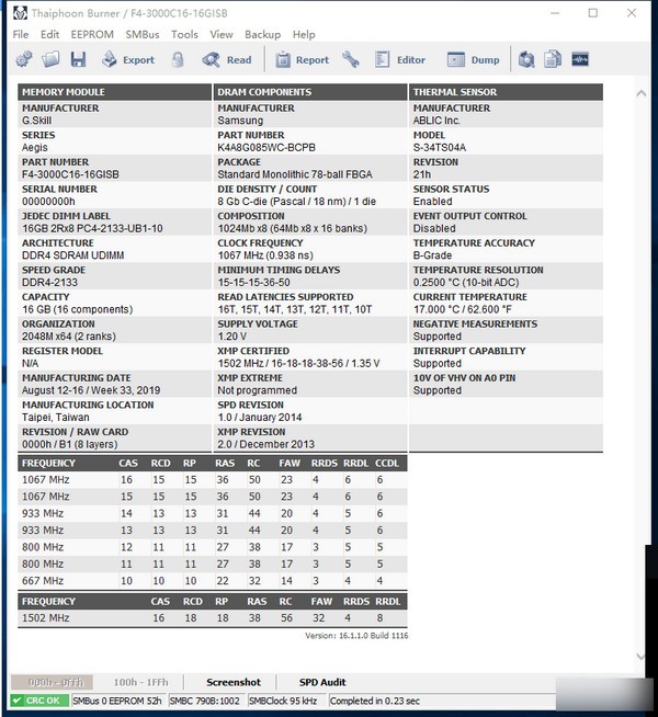 第一列是內存廠家信息,我的是芝奇(G.skill)aegis系列。16G,DDR4 2133,雙面(單面8G)