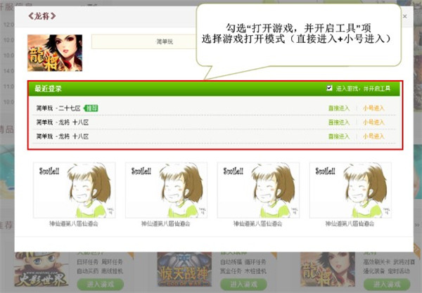3、若之前使用過松果玩游戲,則在最近登錄內(nèi)可以查看相關(guān)的游戲記錄,勾選“進(jìn)入游戲,并開啟工具”項(默認(rèn)選中),然后點擊“直接進(jìn)入”或“小號進(jìn)入”即可快速進(jìn)入游戲并打開工具。