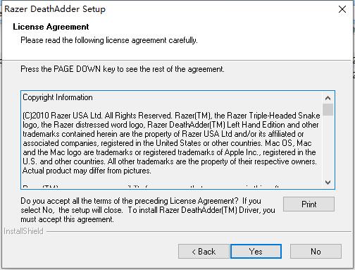 2、進(jìn)入雷蛇鼠標(biāo)驅(qū)動安裝協(xié)議界面,點(diǎn)擊【yes】
