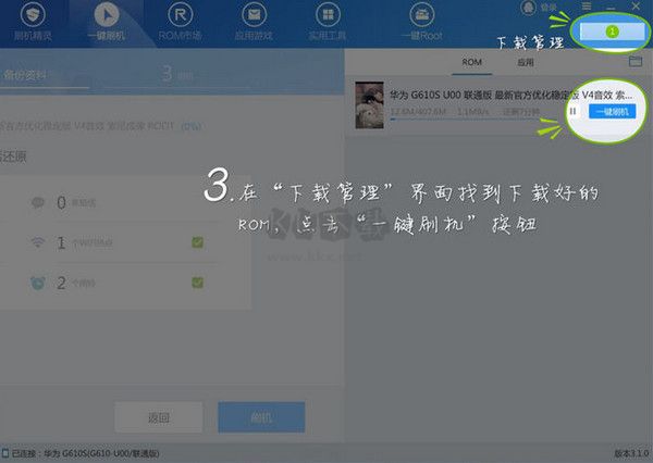 如果您還沒(méi)有下載ROM包,則點(diǎn)擊軟件的"前往下載",在ROM市場(chǎng)中選擇喜歡的ROM,點(diǎn)擊“一鍵刷機(jī)”按鈕,即可開(kāi)始下載ROM包。