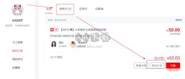 2、在訂單設置界面就可以看到剛剛下單的課程了,具體查看方法就是選擇“待支付”,在該界面下就可以看到還未支付的訂單,選擇對應訂單點擊右邊的“取消訂單”即可。