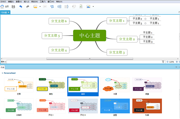 5、完成大致的框架之后,依照個(gè)人習(xí)慣調(diào)整圖的結(jié)構(gòu)、線(xiàn)條、風(fēng)格等,讓圖看著更舒服。XMind為用戶(hù)提供了“風(fēng)格”選項(xiàng),選擇“窗口”>“風(fēng)格”指令,打開(kāi)風(fēng)格窗口進(jìn)行選擇應(yīng)用。風(fēng)格是一組包含思維圖、主題、線(xiàn)條等各種元素的一些屬性的集合。