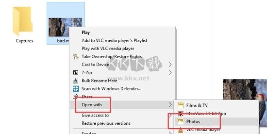 1、打開(kāi)照片應(yīng)用程序。首先在計(jì)算機(jī)驅(qū)動(dòng)器上找到要修剪的視頻文件,然后右鍵單擊“打開(kāi)方式”>“照片”。