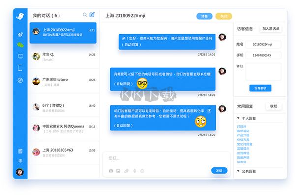 預設常用聊天消息和網(wǎng)址,聊天中快速調(diào)用,節(jié)省客戶等待時間。
